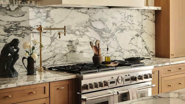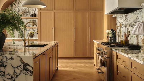 This kitchen, designed by Jaclyn Genovese of Spaces by Jacflash, was created to feel both approachable and thoughtfully detailed. Fully integrated Thermador appliances keep the space functional and clean, while oak millwork, bold marble, and a textured limewash hood layer in warmth and character. Every detail was considered so the appliances don't interrupt the design—they become part of it.