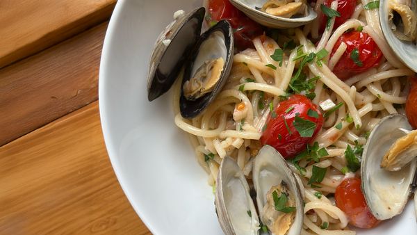 Finish the dish by placing the cooked clams on top of the pasta, and drizzle with olive oil.